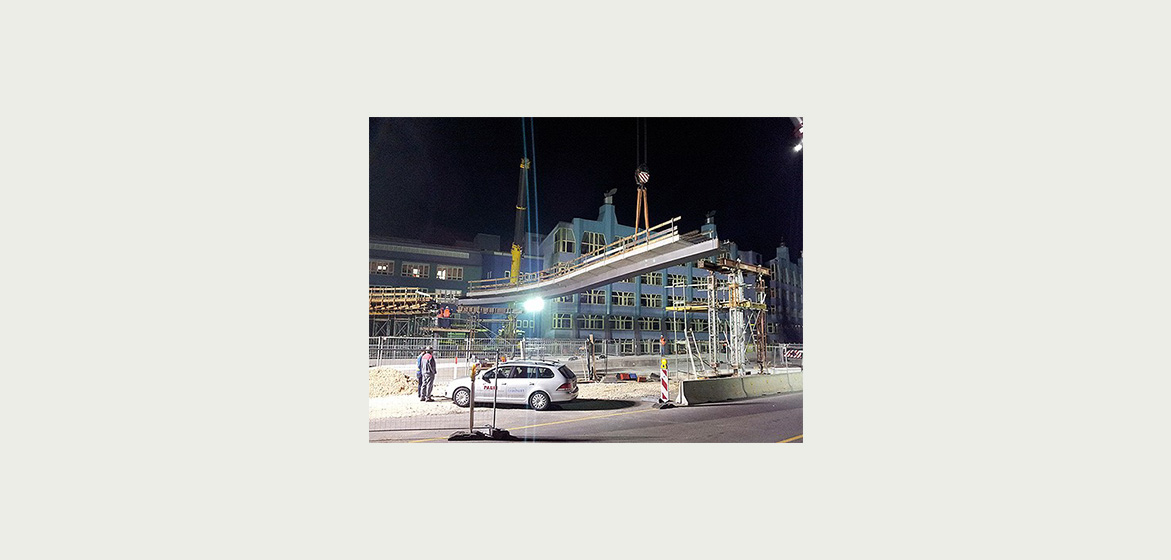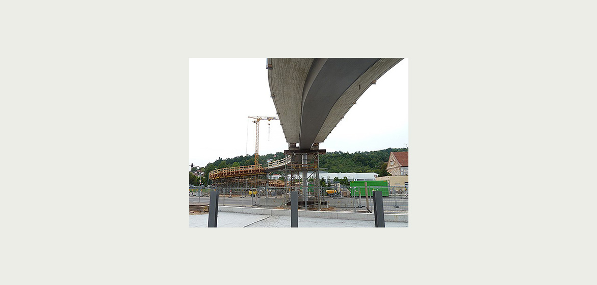 Neubau einer Geh- und Radwegbrücke über die B 29 und die Rems im Zuge des Baus der Ortsumfahrung Schwäbisch Gmünd (Tunnel). Überquerung mittels monolithisch eingespanntem Durchlaufträger über 9 Felder in gekrümmtem Verlauf mit Spannweiten bis 27 m und einer Gesamtlänge von 150 m. Überbau als Plattenbalkenquerschnitt in Stahlbeton bzw. Verbund mit Bauhöhen von 45 bis 70 cm und einer Nutzbreite von 3,0 m. Die Mittelfelder werden vorgefertigt und eingehoben.