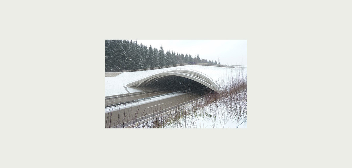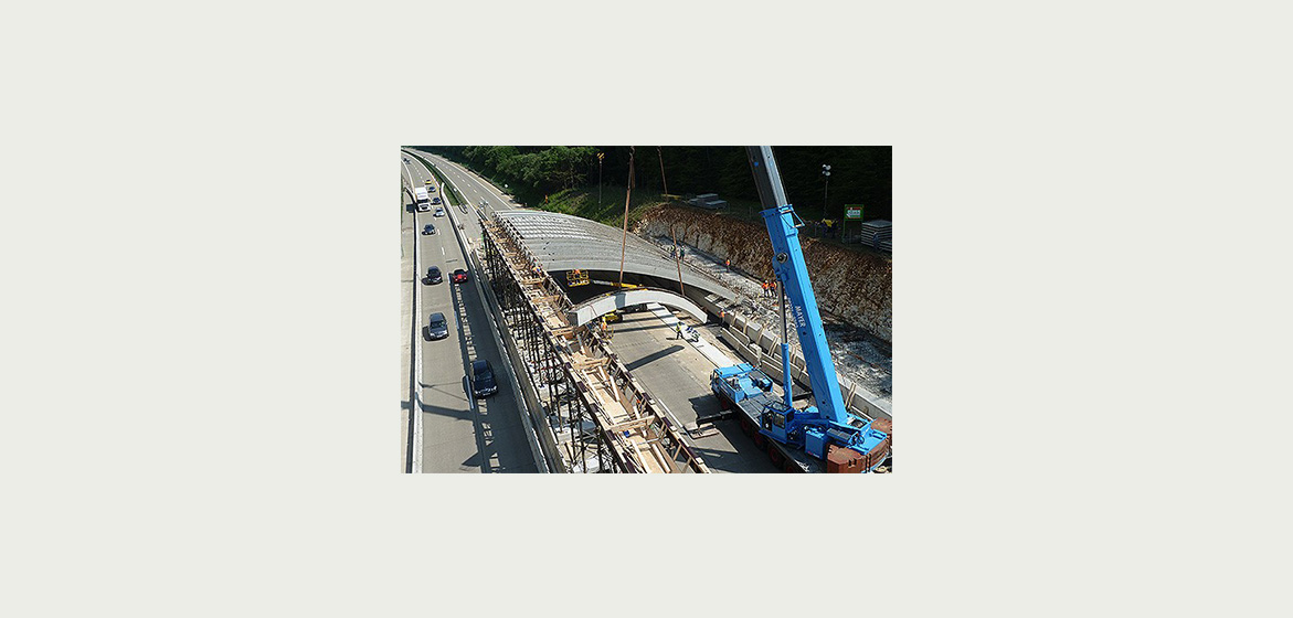 Neubau einer Grünbrücke als Querungshilfe im Rahmen der Wiedervernetzung von Lebensräumen über die BAB A 7 bei Heidenheim. Ausführung als erdüberschüttetes Stahlbeton-Gewölbe mit ca. 42 m Spannweite und einer Länge von knapp 80 m. Im Querschnitt ist das Gewölbe als aneinandergereihte Plattenbalken mit einem Raster von 2,50 m ausgebildet. Die Herstellung erfolgte mit Fertigteilen (FT-Bögen und Halbfertigteil-Deckenplatten) sowie mit Aufbeton.