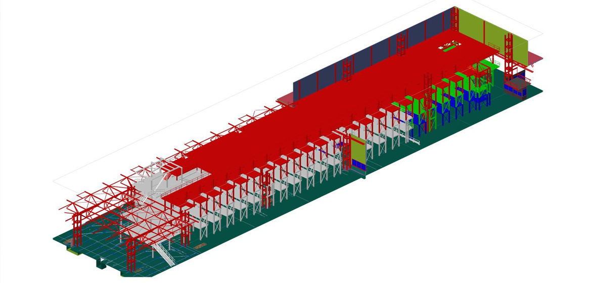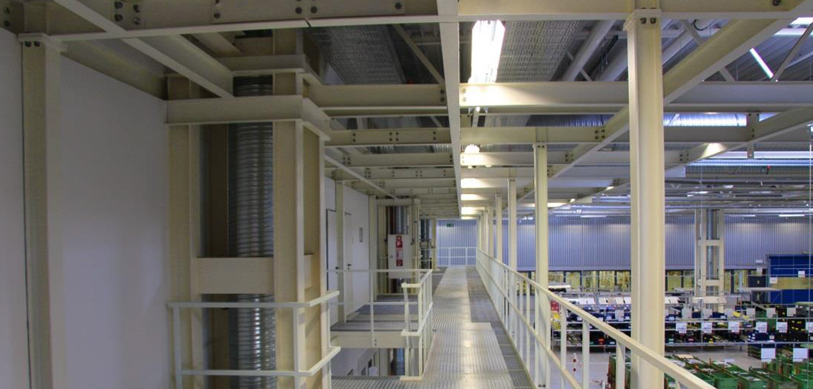 Das anspruchsvolle Projekt haben wir von der Konzeptentwicklung für die Unterkonstruktionen der Fördertechnik bis zur Umsetzung in 3 Erweiterungsstufen, die eine Bühnenkonstruktion über 4 Ebenen bis unter das Bestandsdach erforderte, betreut. Diese Erweiterungsmaßnahmen erfolgten jeweils bei voller Produktionsauslastung in Kölleda und laufendem Betrieb, so dass sich durch die Rahmenbedingungen ein komplexer Bauablauf ergab.