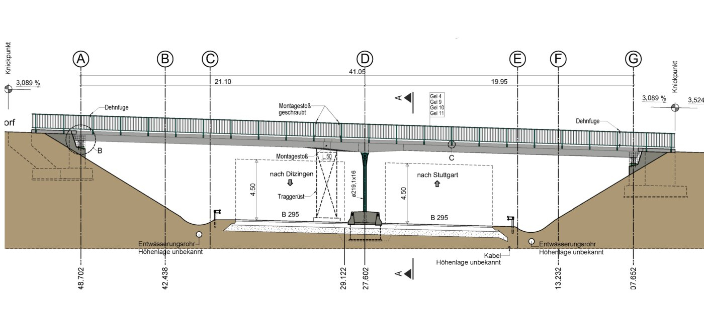 Im Zuge der Ortsumfahrung Weilimdorf liegt die im Jahr 1985 aus Holz erstellte einstreifige Wirtschaftswegbrücke über die B295.